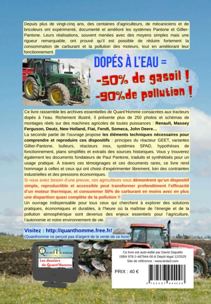 Ce livre présente, pour la première fois en un volume unique, l’ensemble des réalisations agricoles françaises utilisant les réacteurs Gillier-Pantone, telles qu’elles ont été documentées pendant plus de vingt-cinq ans sur le site de référence Quant’Homme. Plus de deux cents photos couleur, des montages détaillés, des retours de terrain, des plans, des mesures et des dizaines de témoignages d’agriculteurs composent un document technique indispensable pour tous ceux qui souhaitent comprendre, analyser ou reproduire ces systèmes de dopage à l’eau.