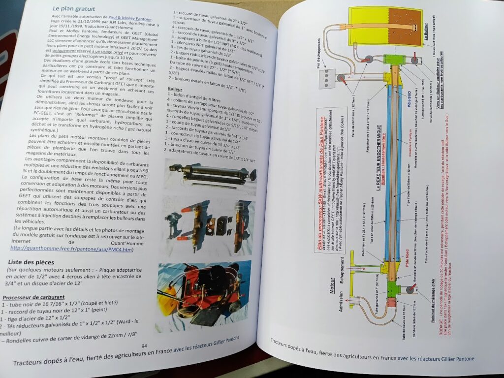 La seconde partie regroupe les documents techniques essentiels : extraits du brevet Pantone, plans de réacteurs, schémas SPAD, analyses de Christophe Martz, retours d’expérimentateurs, hypothèses de fonctionnement, conseils de construction et éléments de diagnostic. L’objectif est de fournir au lecteur un ensemble cohérent lui permettant de comprendre la logique du système, d’en évaluer la pertinence et, le cas échéant, de le reproduire sur un moteur ancien non électronique.